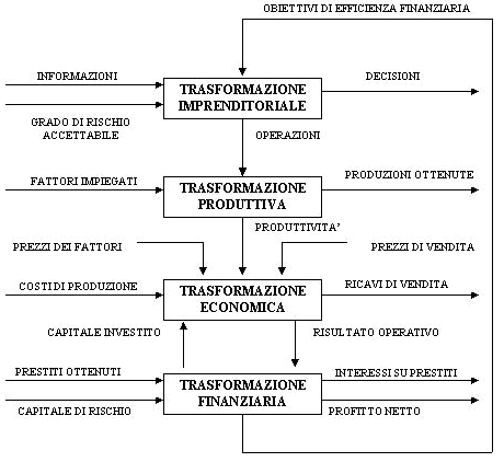 In questo caso l'investimento non sarebbe in grado di mantenere finanziariamente integro il capitale di 1.000 investito per ottenere i redditi annui di 110. Facendo riferimento all'impresa, l'investitore del capitale di rischio - cioè il soggetto che ha conferito il capitale proprio, CN - si aspetta che il management sia in grado di mantenere finanziariamente integro nel tempo il valore di tale capitale; questa condizione si manifesta quando l'impresa consente di ottenere redditi almeno uguali a quelli ottenibili dal migliore investimento alternativo. Da queste relazioni si deduce, quindi, come l'obiettivo manageriale massimo, nelle imprese considerate quali trasformatori finanziari, sia quello del mantenimento dell'integrità finanziaria del capitale in esse investito. In genere, quindi, il management non si pone l'obiettivo generico del "massimo profitto", ma specifica desiderati livelli di profitto, in grado di mantenere l'integrità del capitale conferito nell'impresa. [20]. L'impresa moderna può quindi essere considerata un sistema operatore di trasformazione, nel quale sono attuate quattro trasformazioni: 1) produttiva, 2) economica, 3) finanziaria, 4) imprenditoriale, tutte tese a realizzare la massima efficienza. Tale concezione dell'impresa può essere rappresentata nel seguente modello: